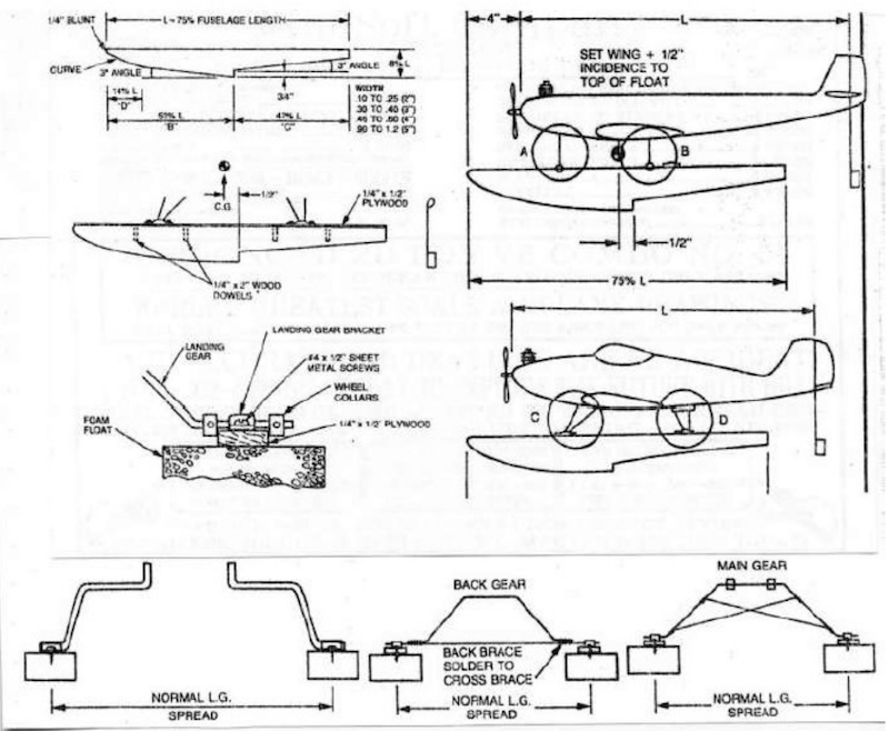 Earlier in the news letter Bill touched on the subject of size. The length of the fuselage is the main factor in determining the length of the float. For most R/C models measure the distance from the back of the prop to the hinge line of the elevator. The length of each float should be at least 75% of this length and not more than 80%; I like 75% best. Make a scale drawing of the float that you are going to use by applying the dimensions on the float drawings.