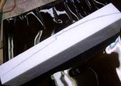 Pin the straight strips along the rear sloping lines on both sides. Using the guides, hot wire the foam until it stops at the plywood insert. Separate the two blanks, and this is what you should have.