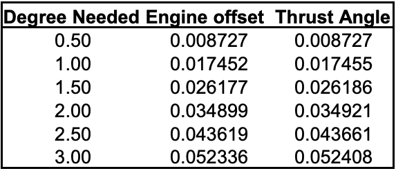 To give an example, the distance between the mounting holes on the same engine is 2.75". If you want a 2.5 degree right thrust angle, then: Thrust Angle Length = 2.75" * tan(2.5) = 0.120". The left side of the engine will need to be extended 0.120" farther than the right to have a thrust angle of 2.5 degrees.